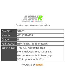 BMW E84 X1 LCI Headlight Halogen O/S Drivers Right Side 63117290236