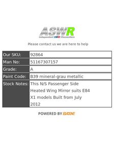 BMW E84 X1 LCI Wing Mirror Heated N/S Passenger Side 51167307157