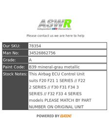 BMW Airbag ECU Control Unit 1 2 3 4 SERIES F20 F22 F30 F32 F33 34526862756