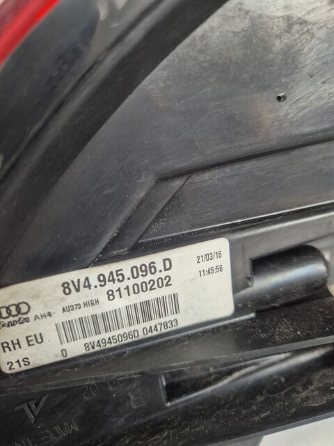 Product: AUDI A3 S3 2016 DRIVERS REAR OUTER TAIL LIGHT LED 5DR 8V4945096D (AGE MARKS)