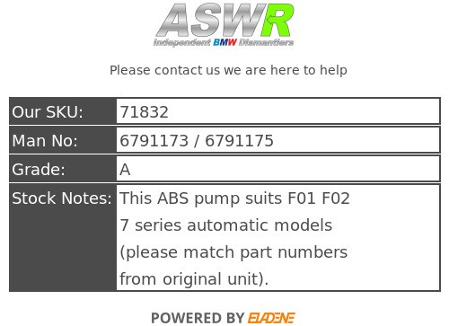 This ABS pump suits F01 F02 7 series automatic models (please match part numbers from original unit).
