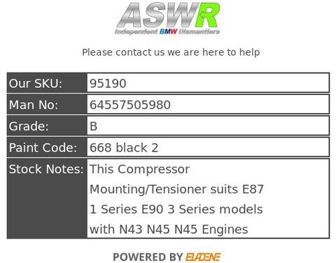 This Compressor Mounting/Tensioner suits E87 1 Series E90 3 Series models with N43 N45 N45 Engines