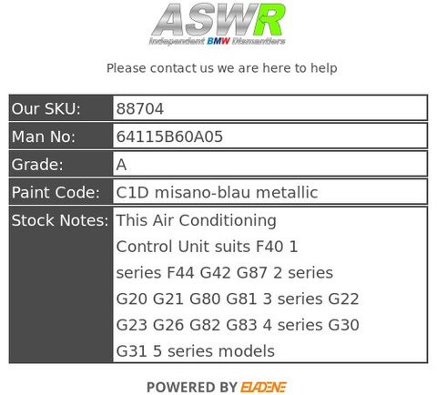 This Air Conditioning Control Unit suits F40 1 series F44 G42 G87 2 series G20 G21 G80 G81 3 series G22 G23 G26 G82 G83 4 series G30 G31 5 series models