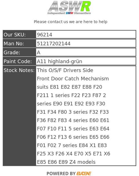 This O/S/F Drivers Side Front Door Catch Mechanism suits E81 E82 E87 E88 F20 F211 1 series F22 F23 F87 2 series E90 E91 E92 E93 F30 F31 F34 F80 3 series F32 F33 F36 F82 F83 4 series E60 E61 F07 F10 F11 5 series E63 E64 F06 F12 F13 6 series E65 E66 F01 F02 7 series E84 X1 E83 F25 X3 F26 X4 E70 X5 E71 X6 E85 E86 E89 Z4 models