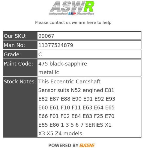 This Eccentric Camshaft Sensor suits N52 engined E81 E82 E87 E88 E90 E91 E92 E93 E60 E61 F10 F11 E63 E64 E65 E66 F01 F02 E84 E83 F25 E70 E85 E86 1 3 5 6 7 SERIES X1 X3 X5 Z4 models
