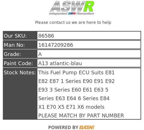 This Fuel Pump ECU Suits E81 E82 E87 1 Series E90 E91 E92 E93 3 Series E60 E61 E63 5 Series E63 E64 6 Series E84 X1 E70 X5 E71 X6 models PLEASE MATCH BY PART NUMBER