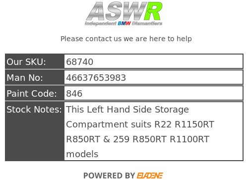 This Left Hand Side Storage Compartment suits R22 R1150RT R850RT & 259 R850RT R1100RT models